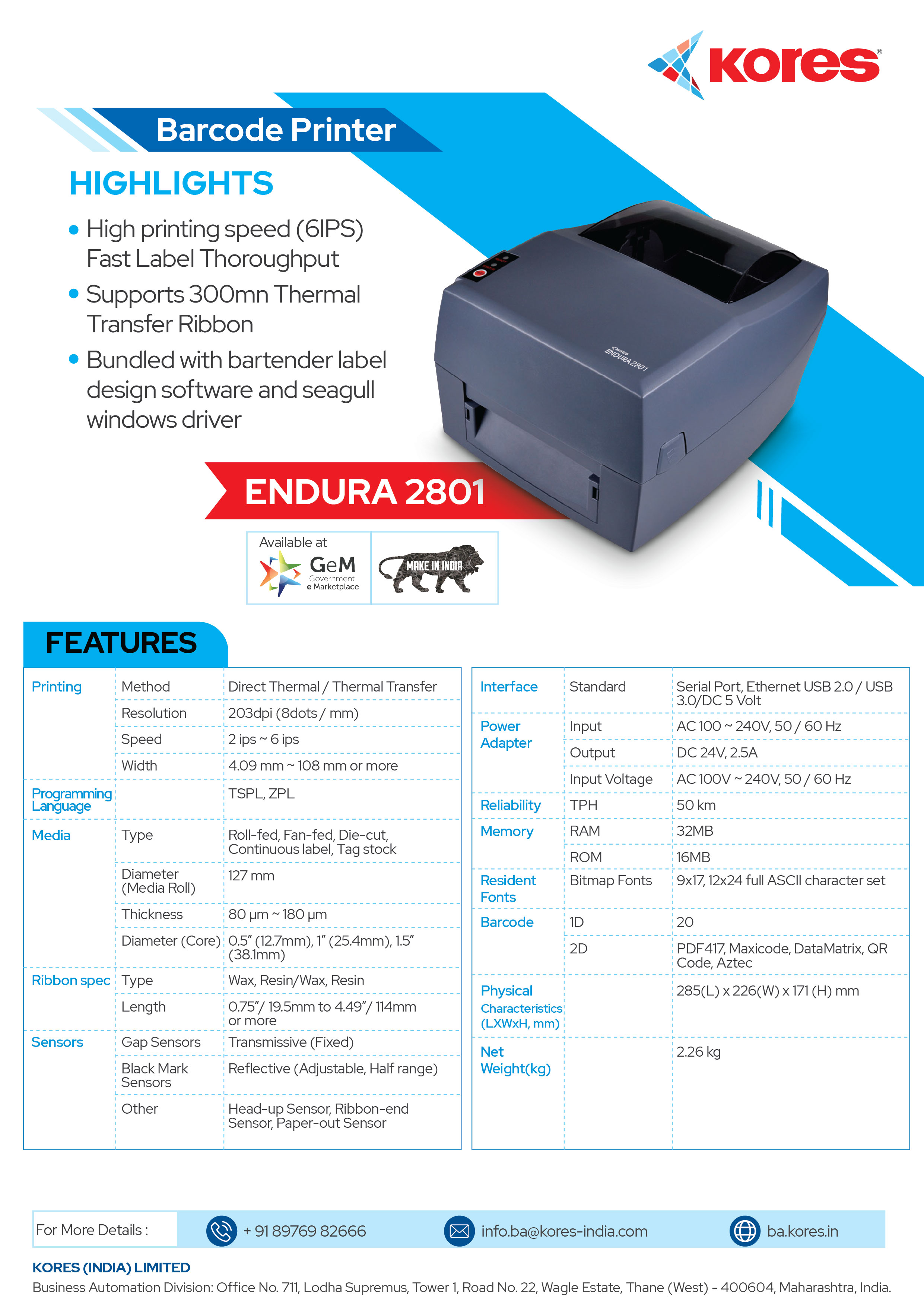 Endura 2801 is designed using ZPL and TSPL, the best programming languages to give commands to printers.