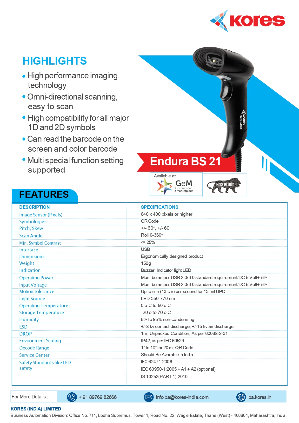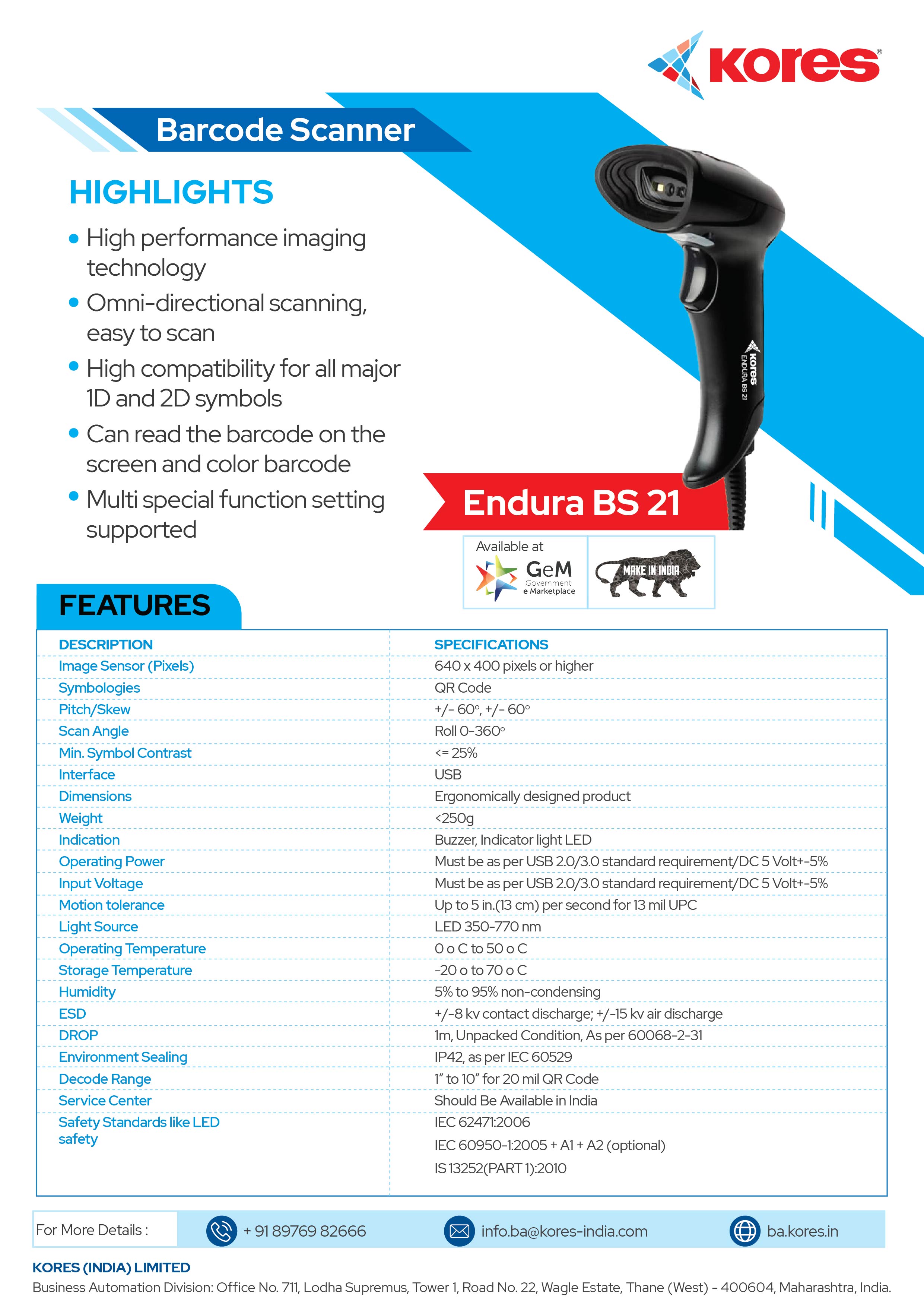 The Endura BS 21 barcode scanner accurately captures 1D and 2D symbol scanning. Its high-performance imaging technology and omnidirectional scanning make it an ideal product for supermarkets. It reduces errors and improves customer service for businesses.